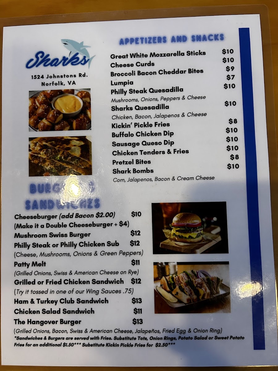 Welcome to Sharks Sports Bar & Grill, a gem located in Norfolk, VA. Here, the menu boasts a delightful array of dishes that cater to all tastes, with a particular emphasis on their celebrated wings. Customers like Mike Altrogge rave about them, deeming them among the best in the area, especially the signature teriyaki wings that Chucky OfVA swears by. Beyond wings, patrons indulge in burgers, praised for their quality and generous portions, making it a favored stop for many.